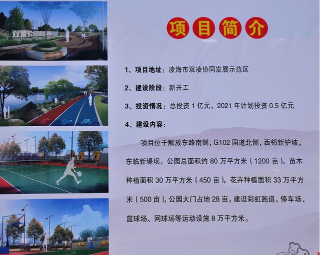建设内容:项目位于解放东路南侧,G102国道北侧,西邻新护坡,东临新堤坝。公园总面积约 80 万平方米(1200 亩 ),苗木种植面积 30 万平方米(450 亩),花卉种植面积 33万平方米(500亩),公园大门占地28亩,建设彩虹跑道、停车场、篮球场、网球场等运动设施8万平方米。双凌协同公园位于双羊旧站以西,小凌河东岸,方圆80万平米,是锦凌同城的重要工程,这个公园建成后,一座新城将在这里拔地而起。还要修建彩虹跑道、停车场、网球场等体育设施,公园的东部将要建设防洪大坝。