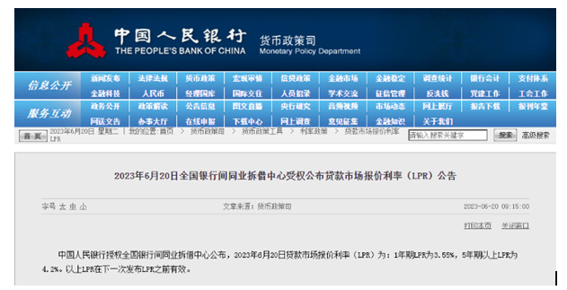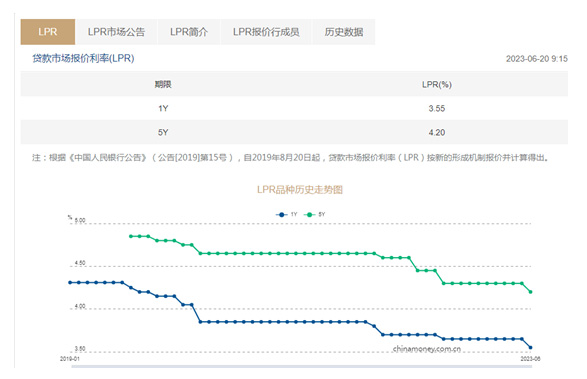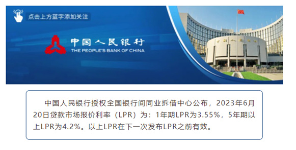 中国人民银行授权全国银行间同业拆借中心公布,2023年6月20日贷款市场报价利率(LPR)为:1年期LPR为3.55%,5年期以上LPR为4.2%。以上LPR在下一次发布LPR之前有效。