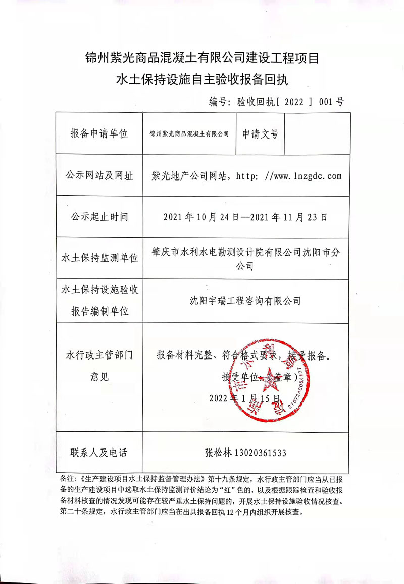首页 > 锦州紫光商品混凝土有限公司建设工程项目水土保持设施自主验收报备回执公示